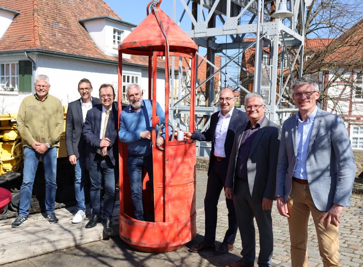 Der Fahrkorb brachte am 4. Juni 1988 die sechs Überlebenden des Grubenglücks Stolzenbach an die Tagesoberfläche zurück. An der Übergabe des einstigen Rettungsgeräts an das Museum wirkten maßgeblich mit (v.l.n.r.): Ulrich Jäger (ehemaliger Betriebsleiter der Abfalldeponie Wabern-Uttershausen), Marcèl Pritsch (Bürgermeister der Stadt Borken), Landrat Winfried Becker (Abfallzweckverband Lahn-Fulda), Ingo Sielaff (Museumsleiter), Michael von Bredow (Stiftung Kreissparkasse Schwalm-Eder), Mario Jahn (Vorstandsmitglied der Sparkasse Borken-Schwalmstadt), Tobias Kreuter (Verwaltungsrat der Sparkasse Borken-Schwalmstadt).