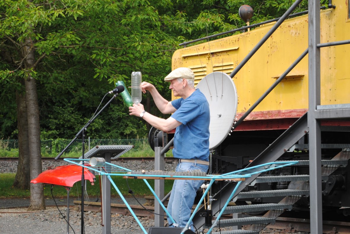 Der Künstler Axel Kretschmer begeisterte die Kinder mit Musikeinlagen, die er auf sehr ungewöhnlichen Instrumenten intonierte. Mal trommelte er auf einem Autokotflügel, mal musizierte er auf einer handelsüblichen Satellitenschüssel. Er ließ musikalische Konservendosen an Schnüren kreisen, entlockte leeren Mineralwasserflaschen Hörenswertes und nutzte auch einen Wäscheständer als Musikinstrument. Seine Zuhörer staunten nicht schlecht, womit man alles musizieren kann. Und vielleicht wundern sich ja heute und zu Hause die Eltern, auf welchen Alltagsgegenständen ihre Sprösslinge Musik spielen.
