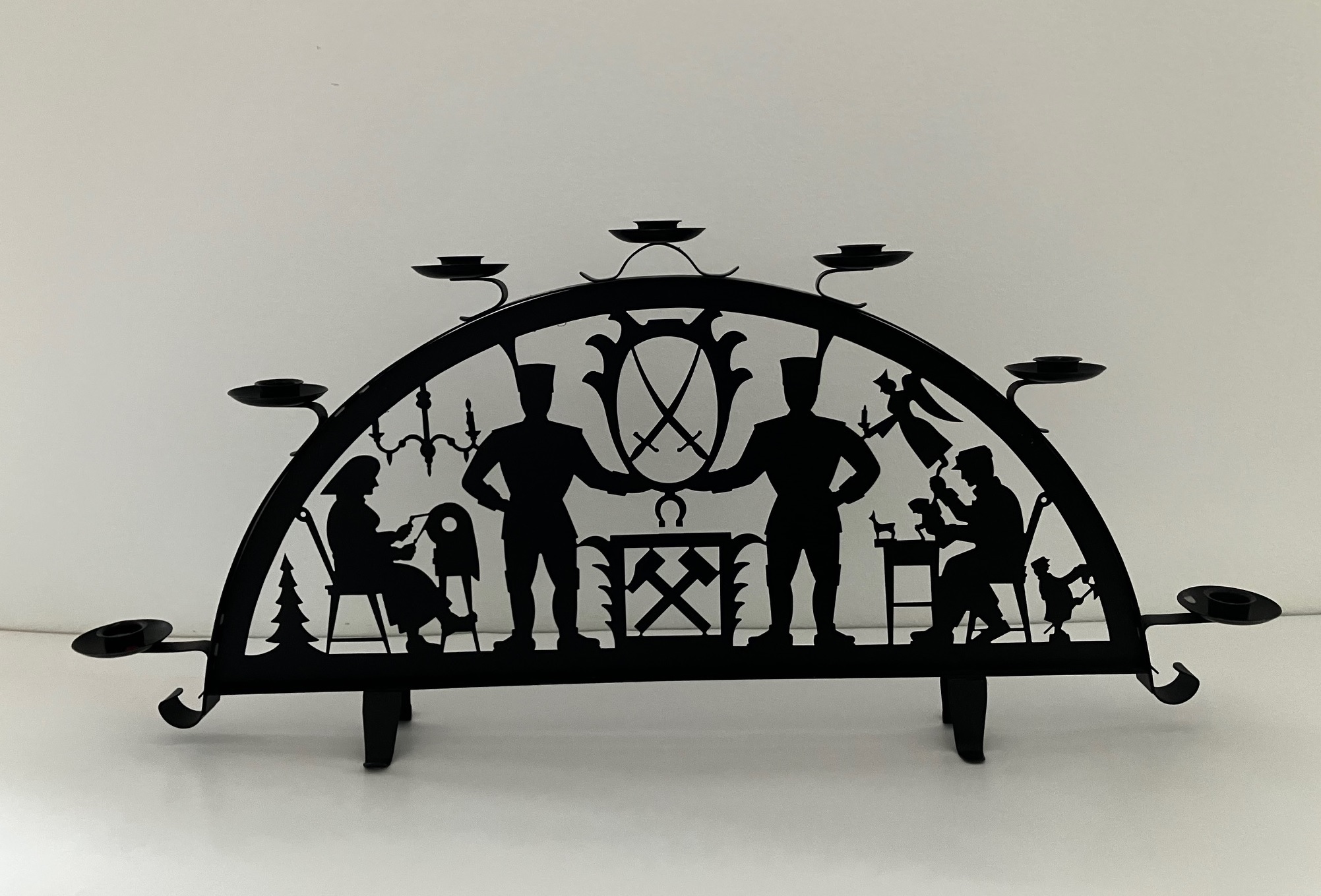 Bei dem hier gezeigten aus Metall gefertigten Schwibbogen, in einer kleineren Ausführung von 50 x 21 cm, weisen ein Engel, ein Tannenbaum und ein Kerzenleuchter auf das Weihnachtsfest hin. Die Bergleute werden nicht nur durch ihre Größe und mittig-symmetrische Anordnung, sondern auch durch ihre typischen Werkzeuge wie Schlägel und Eisen hervorgehoben. Die Hitze Untertage wird durch die von Flammen gerahmten Werkzeuge herausgestellt, die Härte der Arbeit durch einen kleinen Bergmann bei der Arbeit rechts unten in der Ecke betont.